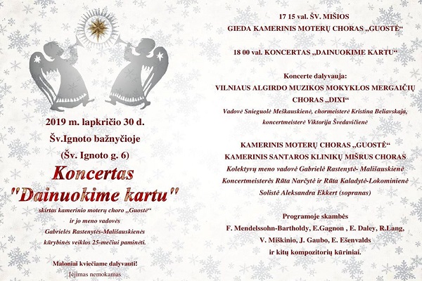18:00: Adventinis koncertas „Nakties tyloje“ (ch. „Šypsena“, „Ortus“, N. Šiliūtės, G.Rastenytės-Mališauskienės, V.Taurinskaitės-Rukšienės mokiniai) – Šv. Ignoto bažnyčia