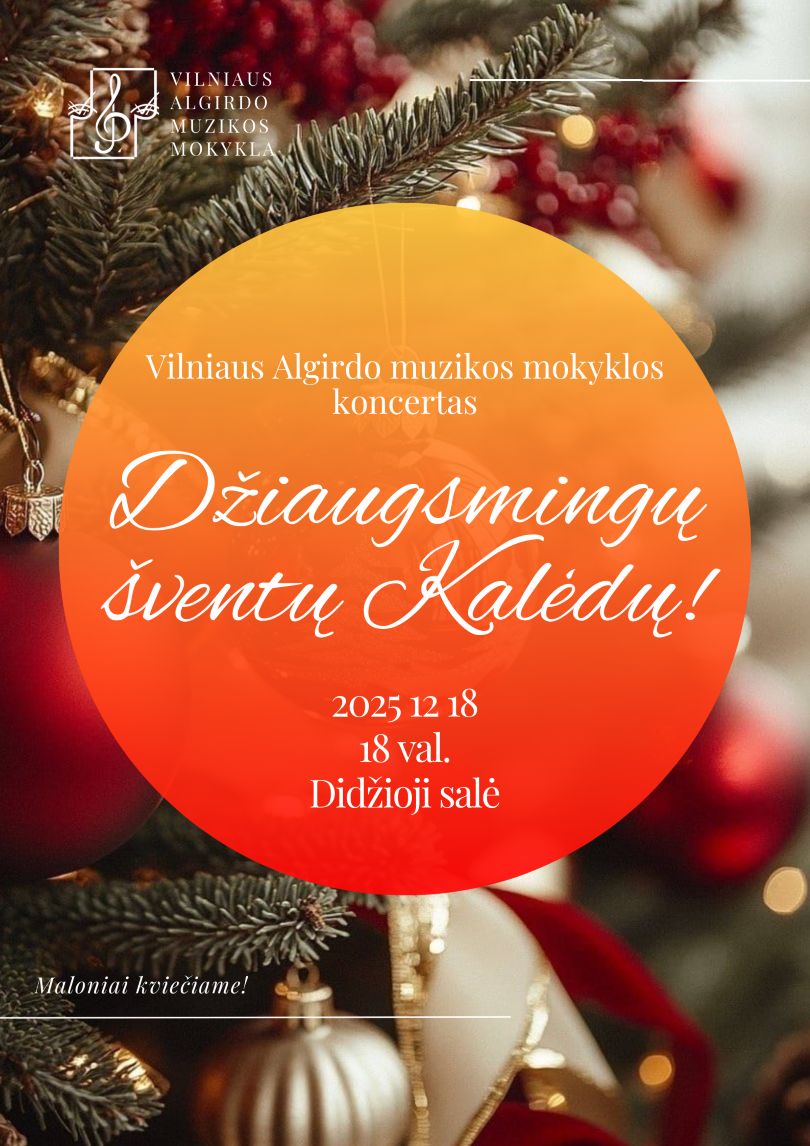 Kviečiame į Vilniaus Algirdo muzikos mokyklos šventinį koncertą „Džiaugsmingų šventų Kalėdų!“, kuris vyks 2025 m. gruodžio 18 d., 18 val. mokyklos Didžiojoje salėje.