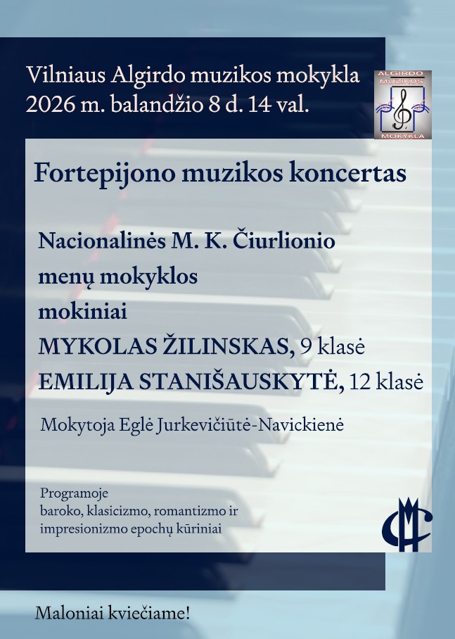 2026 m. balandžio 8 d. 14.00 val. Vilniaus Algirdo muzikos mokyklos Didžiojoje salėje vyks profesionalios muzikos koncertas. Svečiuose – Nacionalinės M. K. Čiurlionio menų mokyklos mokytojos Eglės Jurkevičiūtės-Navickienės mokiniai Mykolas Žilinskas ir Emilija Stanišauskytė. Programoje – baroko, klasicizmo, romantizmo ir impresionizmo epochų kūriniai. Maloniai kviečiame!